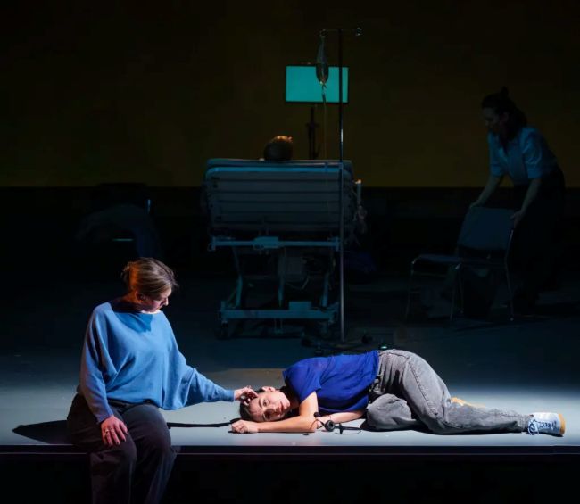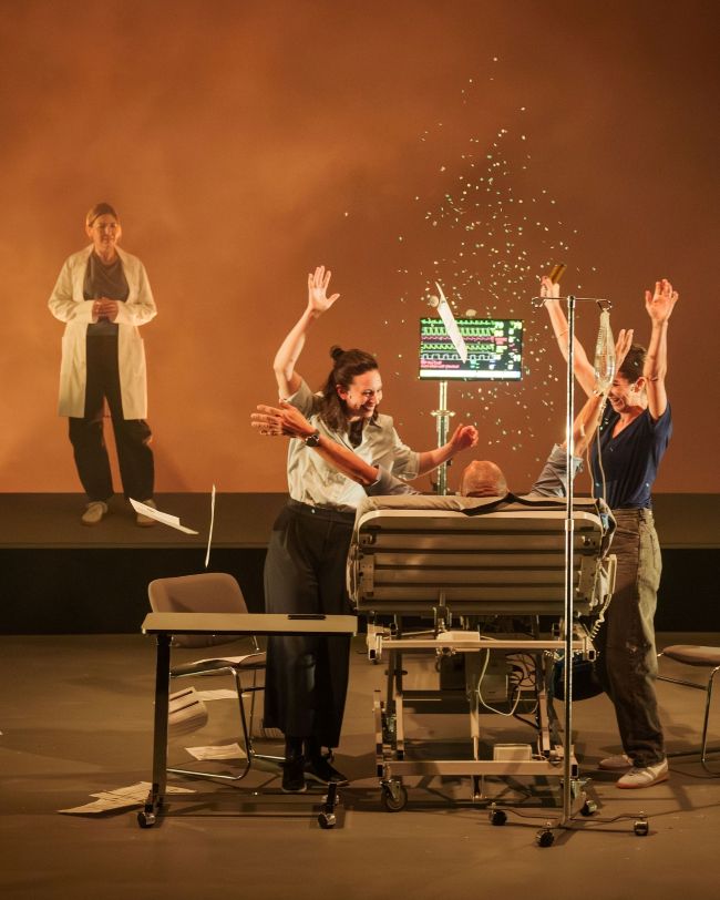 Dès l’arrivée des spectateurs dans la salle, les acteurs sont sur scène. Martin-David Peters qui incarne Pierre Légaré est couché sur un lit d’hôpital, entouré de ses enfants, quelques minutes avant de recevoir l’aide médicale à mourir. C’est alors que la véritable Manuelle Légaré s’amène comme narratrice de sa propre histoire.