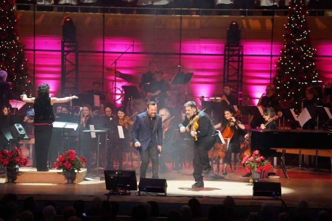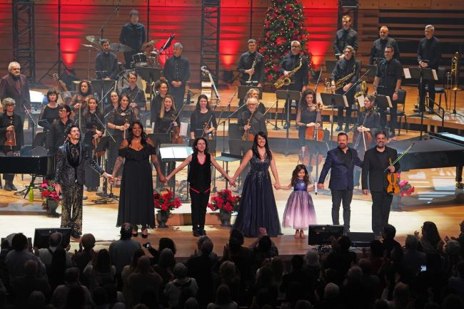 Aux côtés de Mélissa Bédard, particulièrement rayonnante dans le répertoire soul et gospel, Vladimir Kornéev, baryton d’origine géorgienne, apporte une touche classique à ce concert, notamment, avec son magistral Minuit, chrétiens. Quant à Christian Marc Gendron, il est électrisant en s’accompagnant au piano sur des rythmes swing, portés par un orchestre d’une trentaine de musiciens, sous la direction de Marianne Trudel.