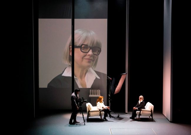 Il y a aussi des scènes tournées en direct qui soulignent efficacement la dimension médiatique de ce conflit. Cependant, les panneaux du centre de la scène déforment les projections en les coupant en deux parties.
