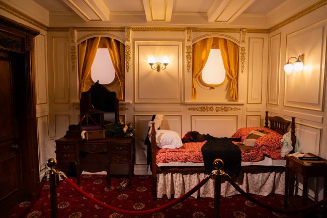 On épie une cabine de passagers finement décorée puis, on arrive devant une reconstitution du hall de la première classe du Titanic, avec son emblématique grand escalier.